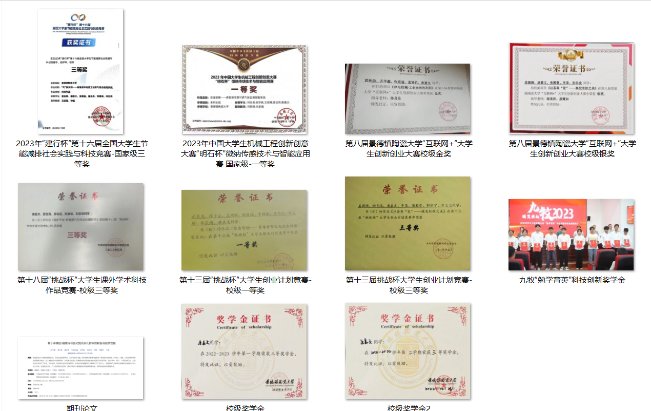 荣誉:本科阶段获得中国大学生机械工程创新创意大赛“明石杯”微纳传感技术与智能应用赛国家级一等奖、第十六届全国大学生节能减排社会实践与科技竞赛三等奖;获得景德镇陶瓷大学“互联网+”大学生创新创业大赛等校级及以上奖项11项;校级奖学金四次。
